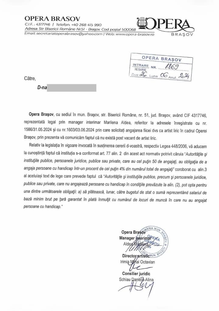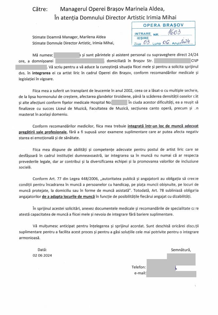 Răspunsul conducerii de atunci – manager interimar Marilena Aldea și director artistic Mihai Irimia – a fost, potrivit informațiilor pe care le am, refuzul angajării. S-a preferat plata contribuției la bugetul de stat în loc de o integrare reală care să o ajute să revină în societate. După un an de dezamăgire și uși închise, tânăra a suferit un accident vascular cerebral.